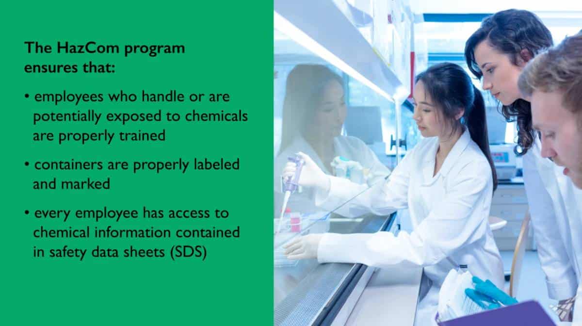 Employees who work with or near hazardous chemicals must receive hazard communication training as part of their job orientation and whenever a new chemical hazard is introduced. Training must cover how to read and understand labels and SDSs, proper storage and handling techniques, and what to do in the event of a spill or exposure. The training should also explain how to use personal protective equipment (PPE) and identify signs of chemical-related health effects. Refresher training may be provided annually or as needed to reinforce safety practices. In higher ed, this training may be coordinated through Environmental Health and Safety (EHS) departments. Comprehensive training helps ensure that employees are aware, prepared, and confident in handling hazardous materials safely.