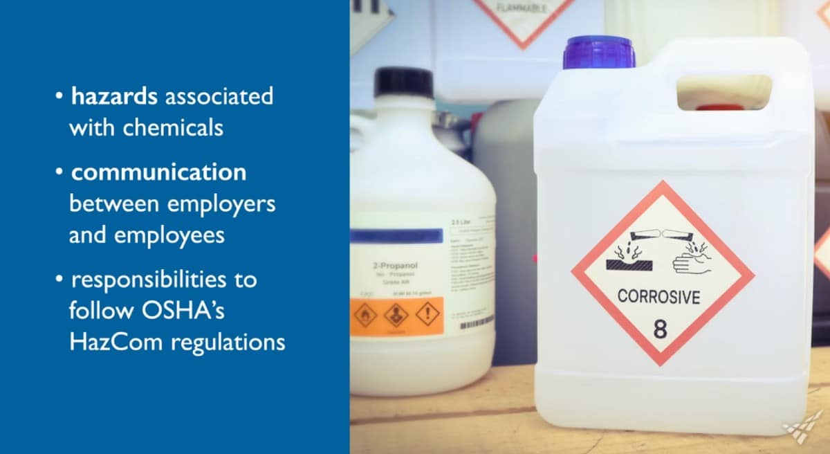 Exposure to hazardous chemicals on the job is a safety concern for millions of workers, including college and university staff. Teaching, administration, and maintenance staff commonly use chemicals for cleaning, disinfection, maintenance, and campus labs. This interactive online course with live action scenarios demonstrates how OSHA’s Hazard Communication regulations can help you work safely with chemicals and prevent injury to yourself and others.