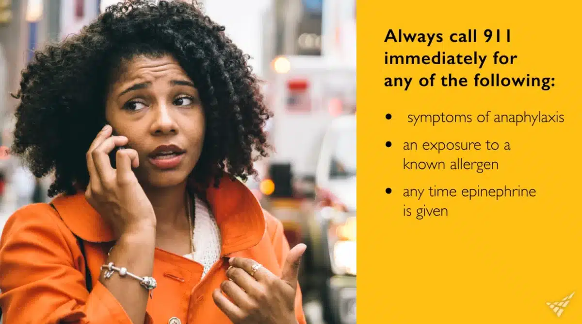 If you suspect anaphylaxis, never leave a student unattended. Call for assistance according to your campus emergency response plan and/or accompany the student to the health room. If you aren’t sure that the student is experiencing anaphylaxis, always play it safe and proceed as if anaphylaxis is occurring. Always call 911 immediately for any of the following symptoms of anaphylaxis – exposure to a known allergen and/or any time epinephrine is given.