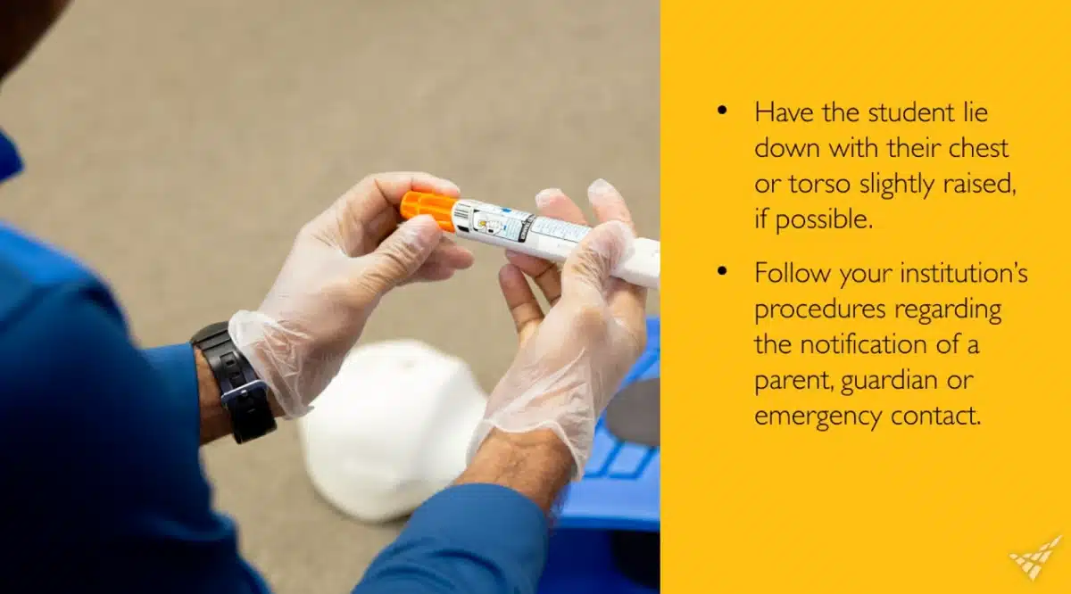 If you suspect anaphylaxis, you should also follow your institution’s policies regarding the use of epinephrine auto-injector, or EAI, or it may be stored in the health room or other designated location. Remove the potential allergens. Have the student lie down with their chest or torso slightly raised if possible, and follow your institution’s procedures regarding the notification of a parent, guardian, or emergency contact. Be prepared to start CPR if the student stops breathing.