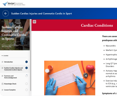 This course covers important aspects related to sudden cardiac injuries and commotio cordis in sport including education, screening recommendations, and emergency action planning for cardiac emergencies.